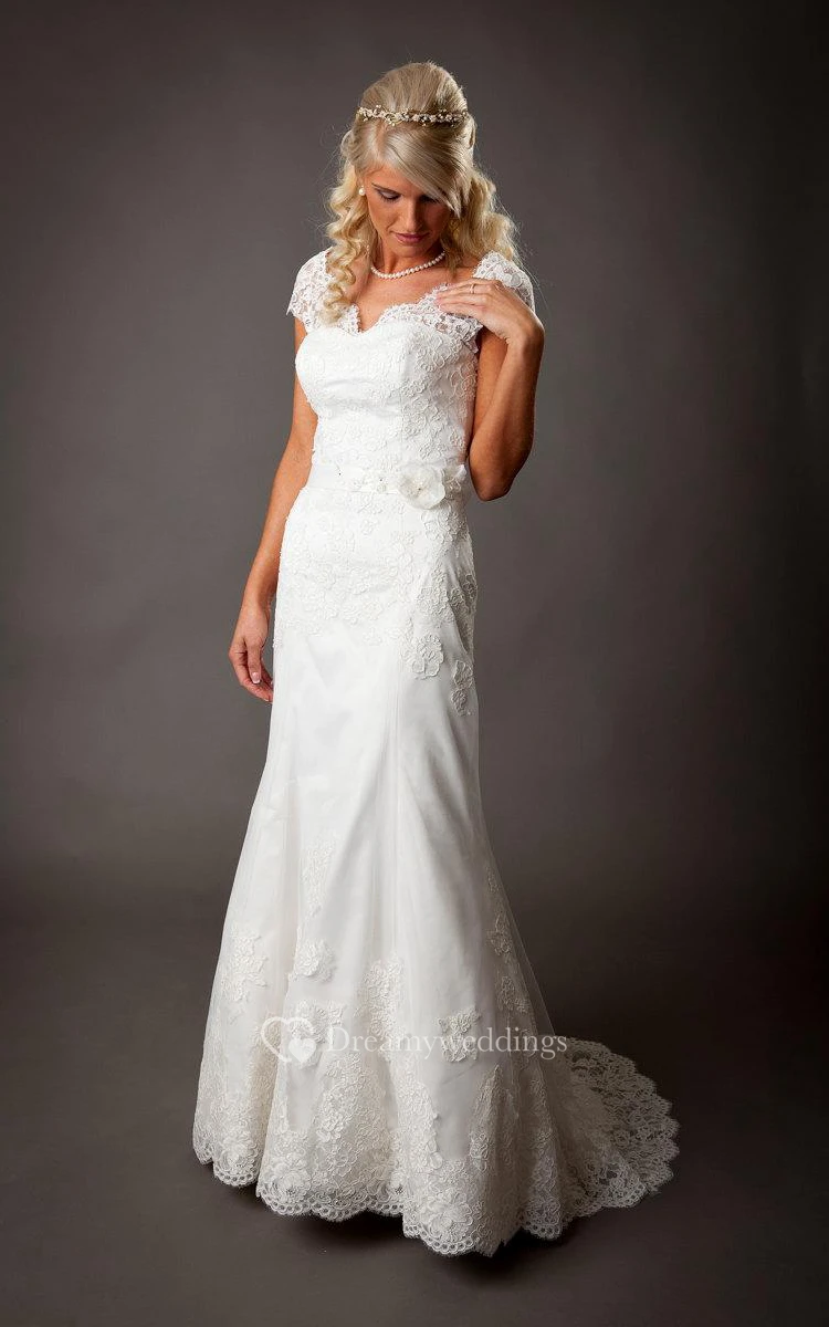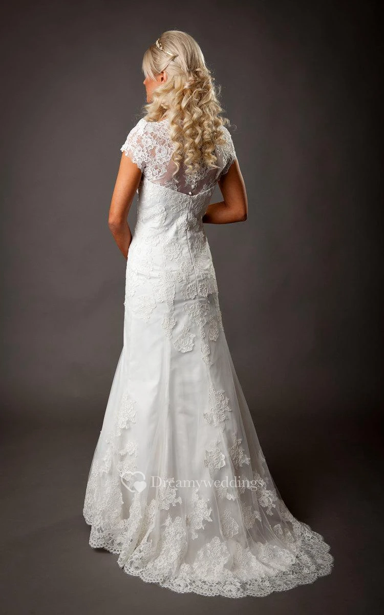 V-Neck Cap Sleeve A-Line Lace Dress With Illusion Back and Satin Bow Sash