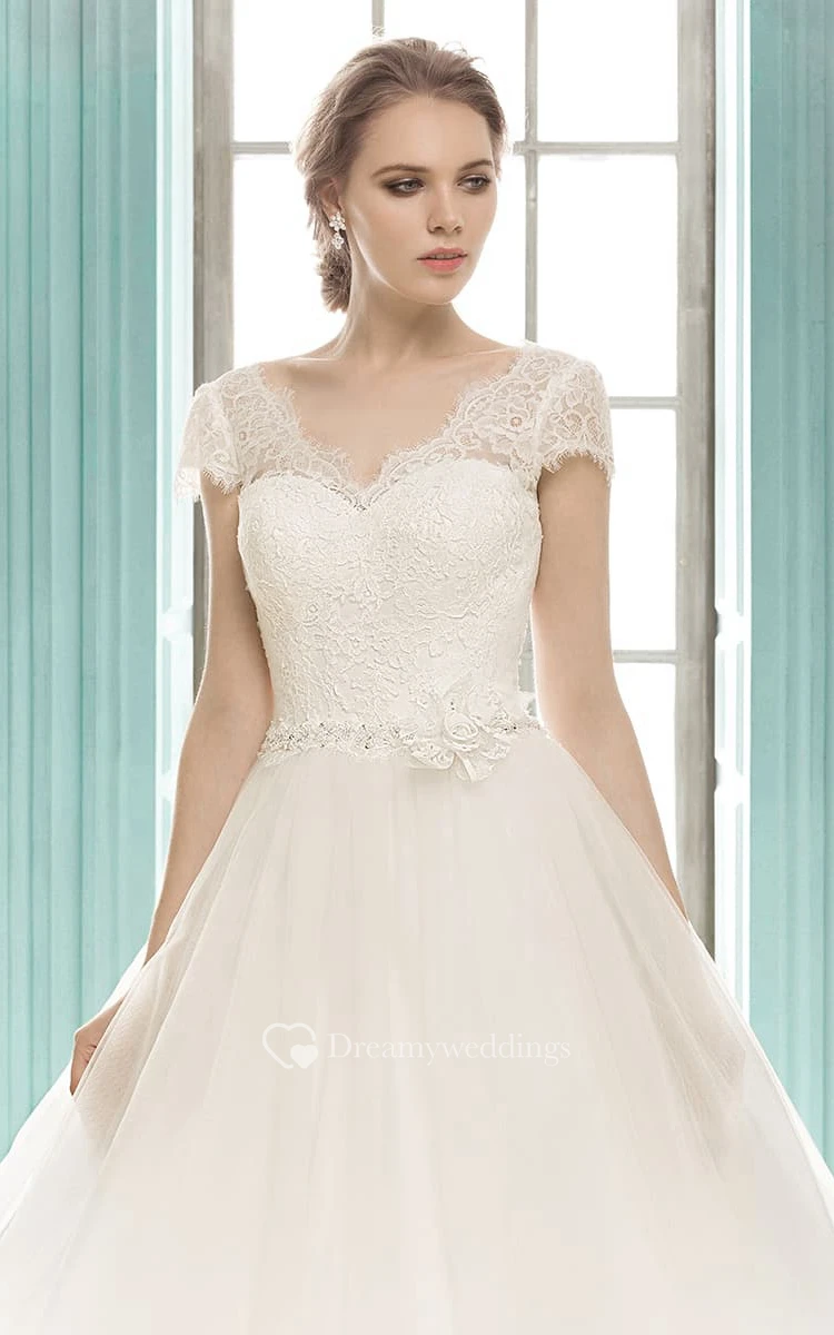 V-neck Cap Sleeve A-line Lace Top Dress With Flower