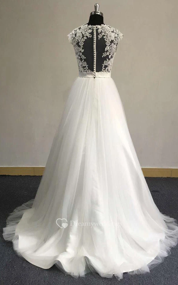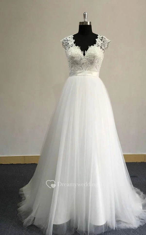 V-Neck Cap Sleeve A-Line Tulle Dress With Satin Sash and Lace Bodice