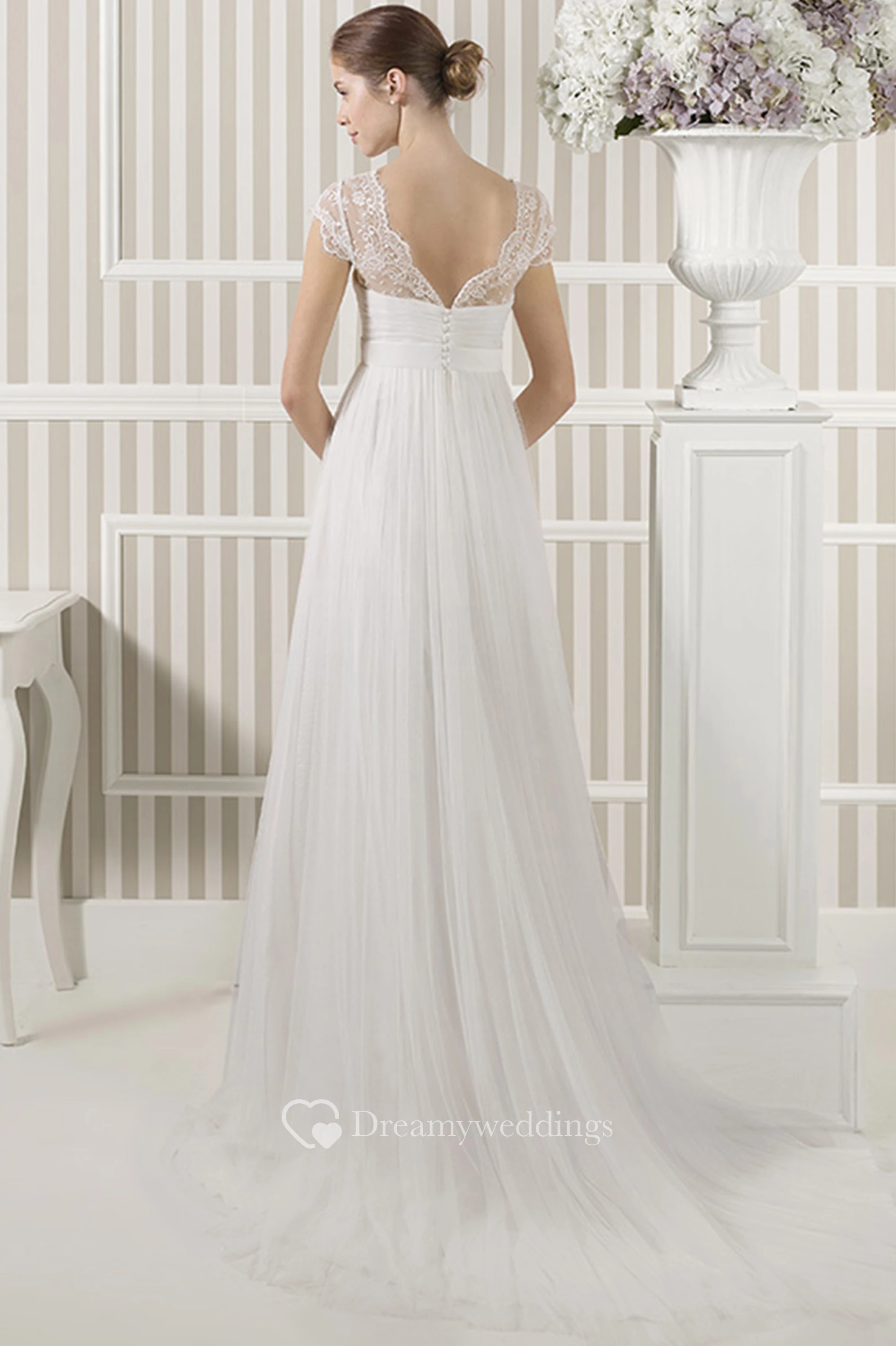 V-Neck Cap Sleeve Appliqued Empire Tulle Wedding Dress