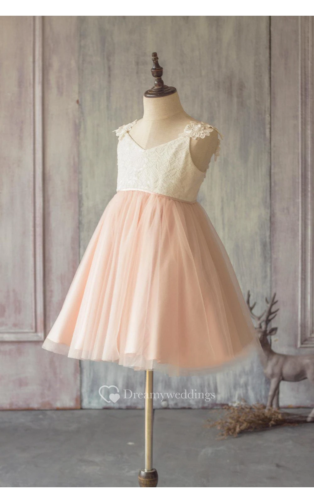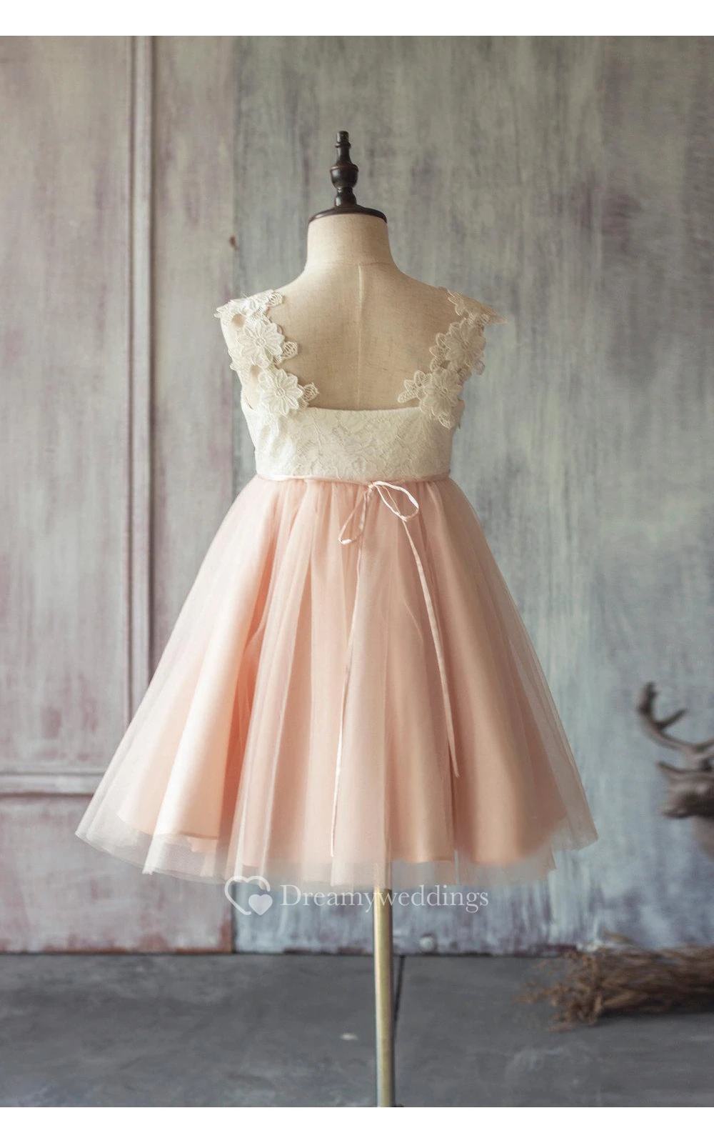V Neck Cap Sleeve Pleated A-line Tulle Tea Length Dress With Applique