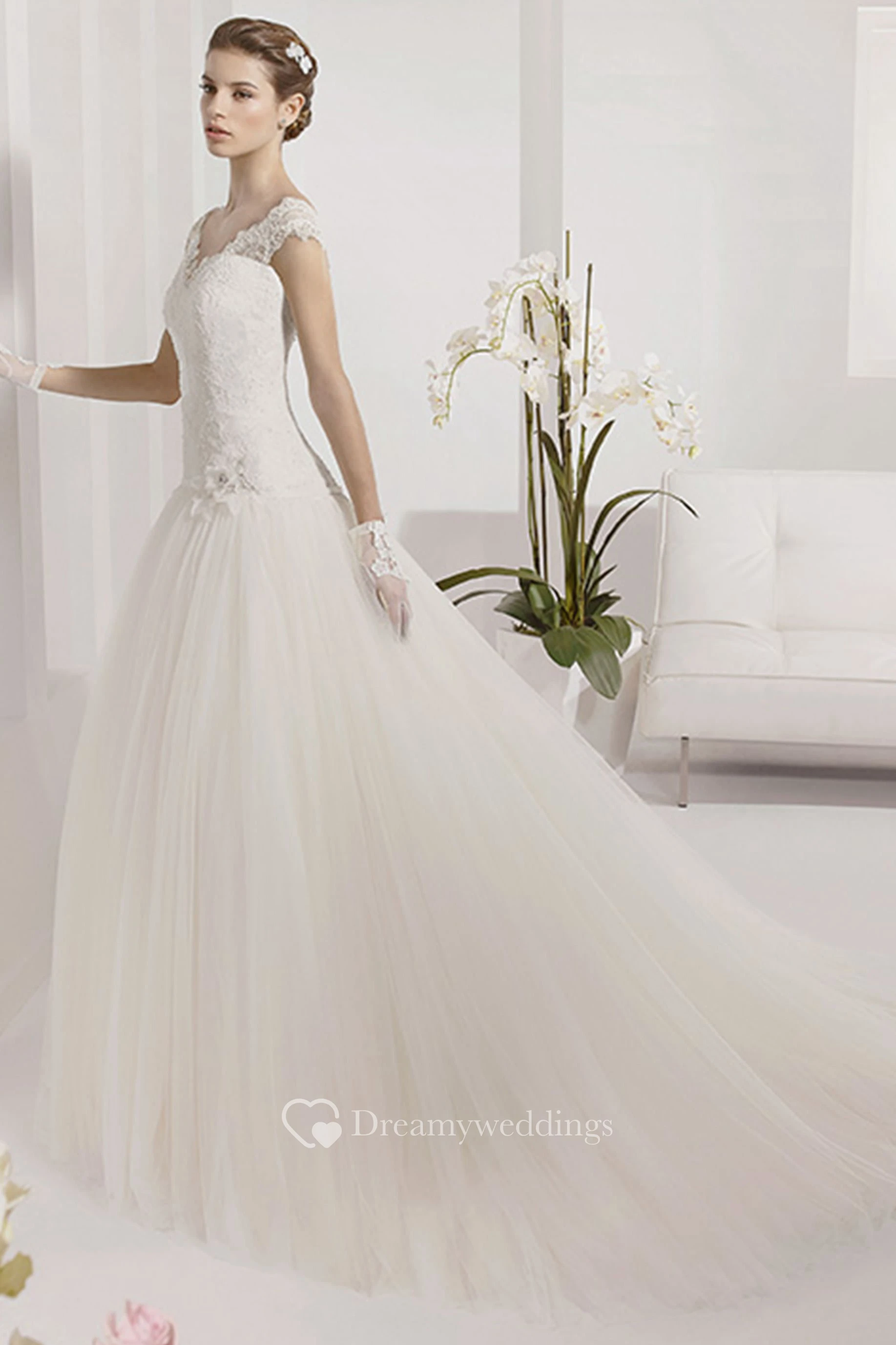 V Neck Cap Sleeve Tulle Ball Gown With Wrop Waist And Flower