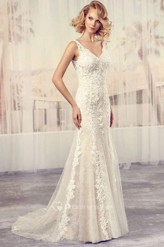 V-Neck Floor-Length Appliqued Lace Wedding Dress With Court Train And V Back