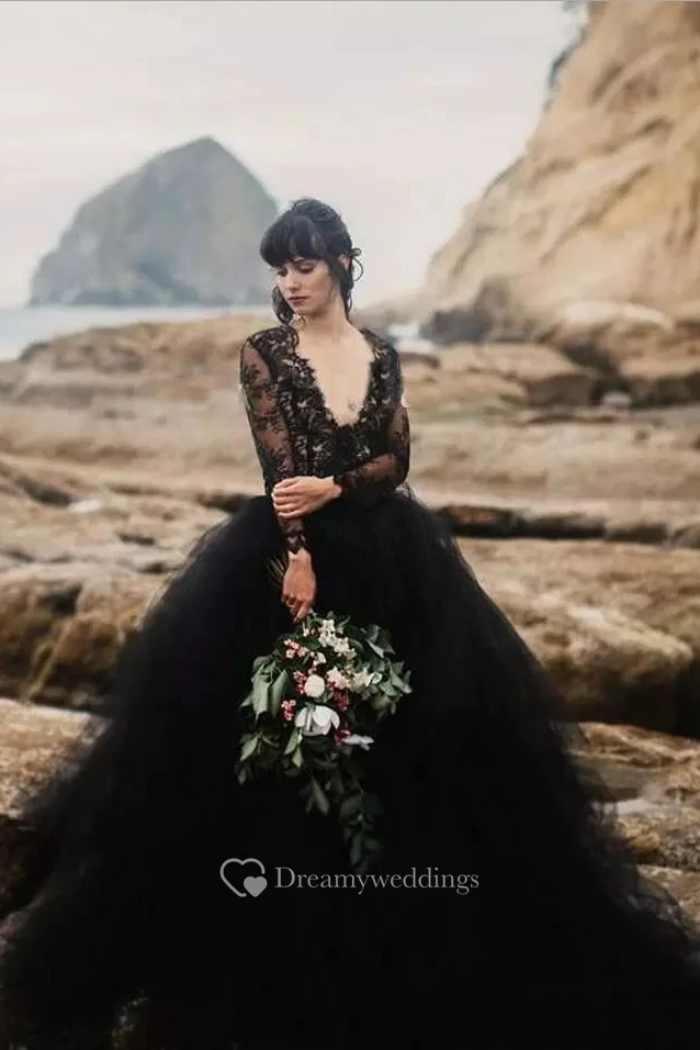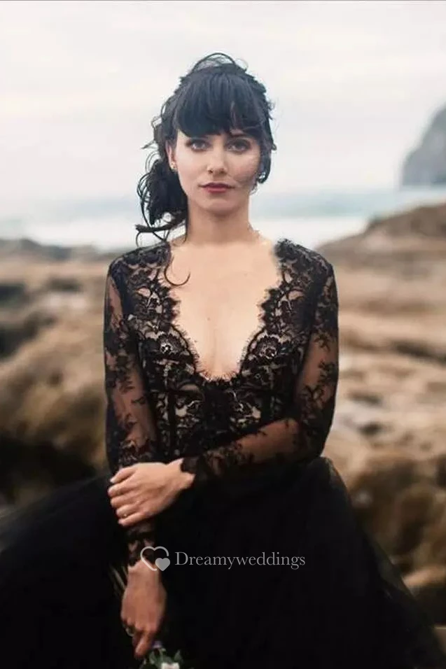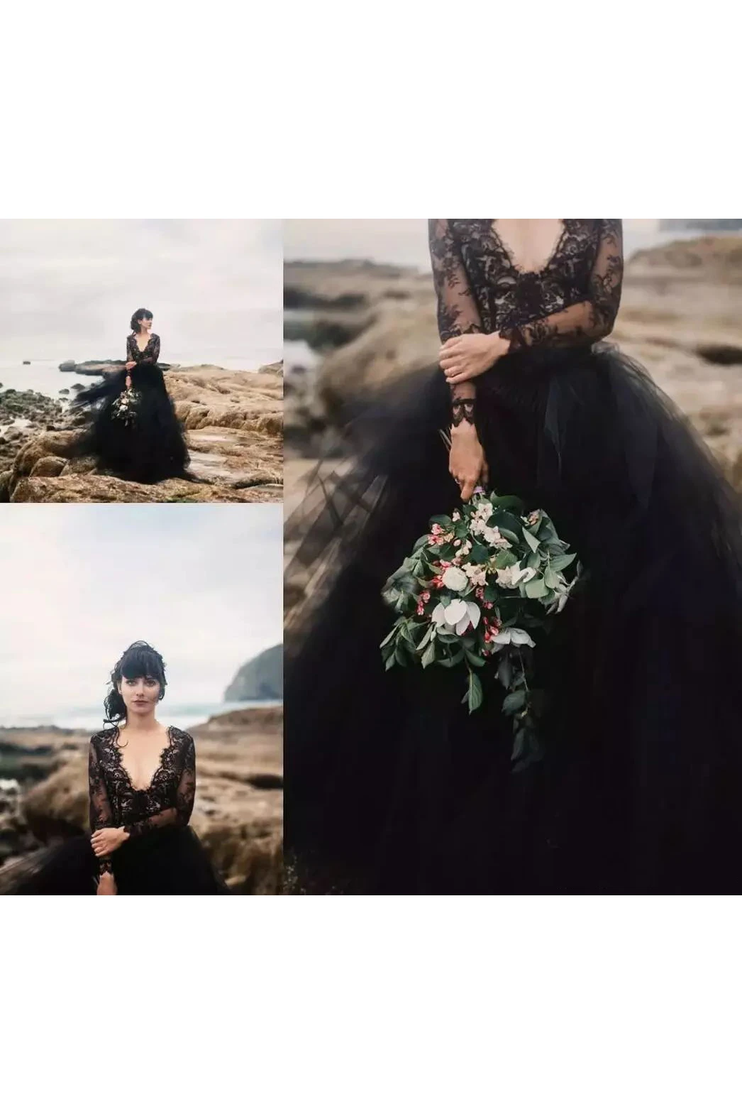 V-neck Illusion Long Sleeve Ankle-length Lace Tulle A-Line Ball Gown Wedding Dress