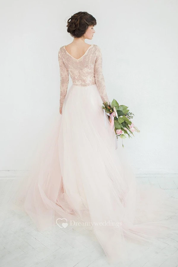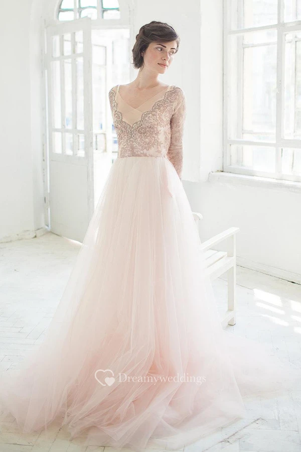 V-Neck Illusion Long Sleeve Tulle A-Line Dress With Beading