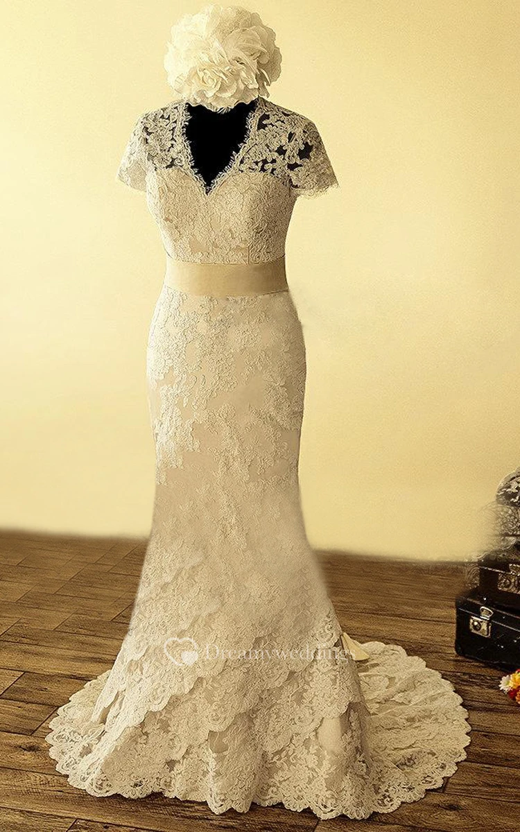 V-Neck Keyhole Back Mermaid Lace Wedding Dress With Sash And Flower