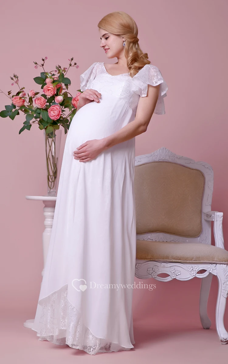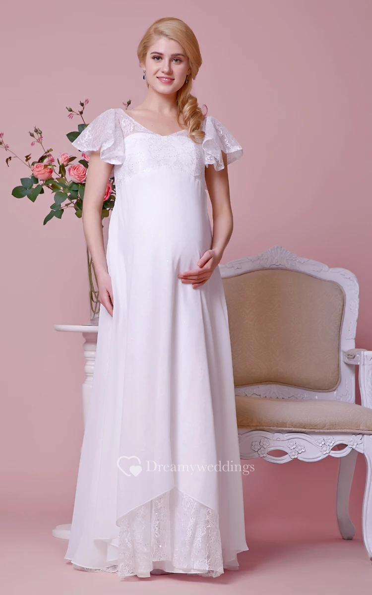 V-neck Lace Bodice Empire Waist Chiffon Long Dress With Cap Sleeves