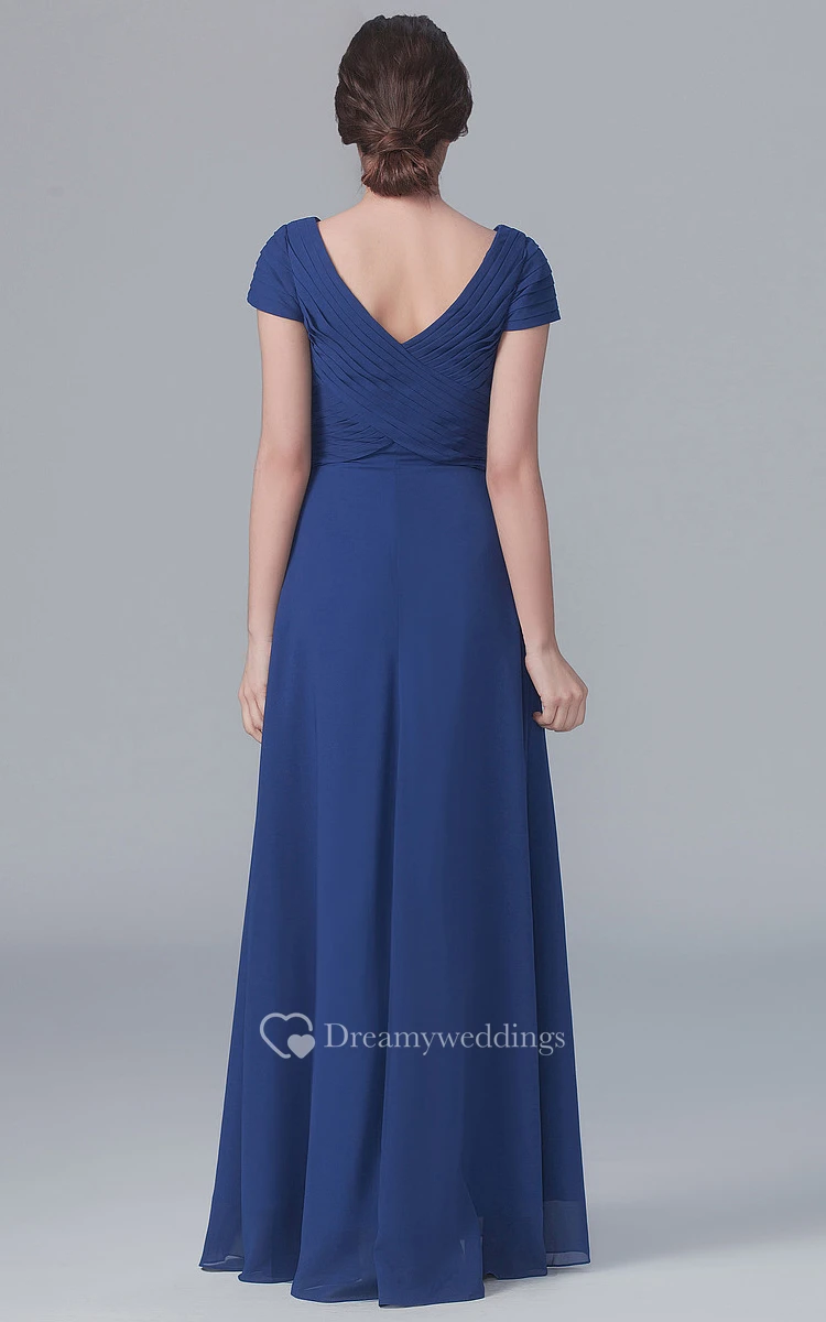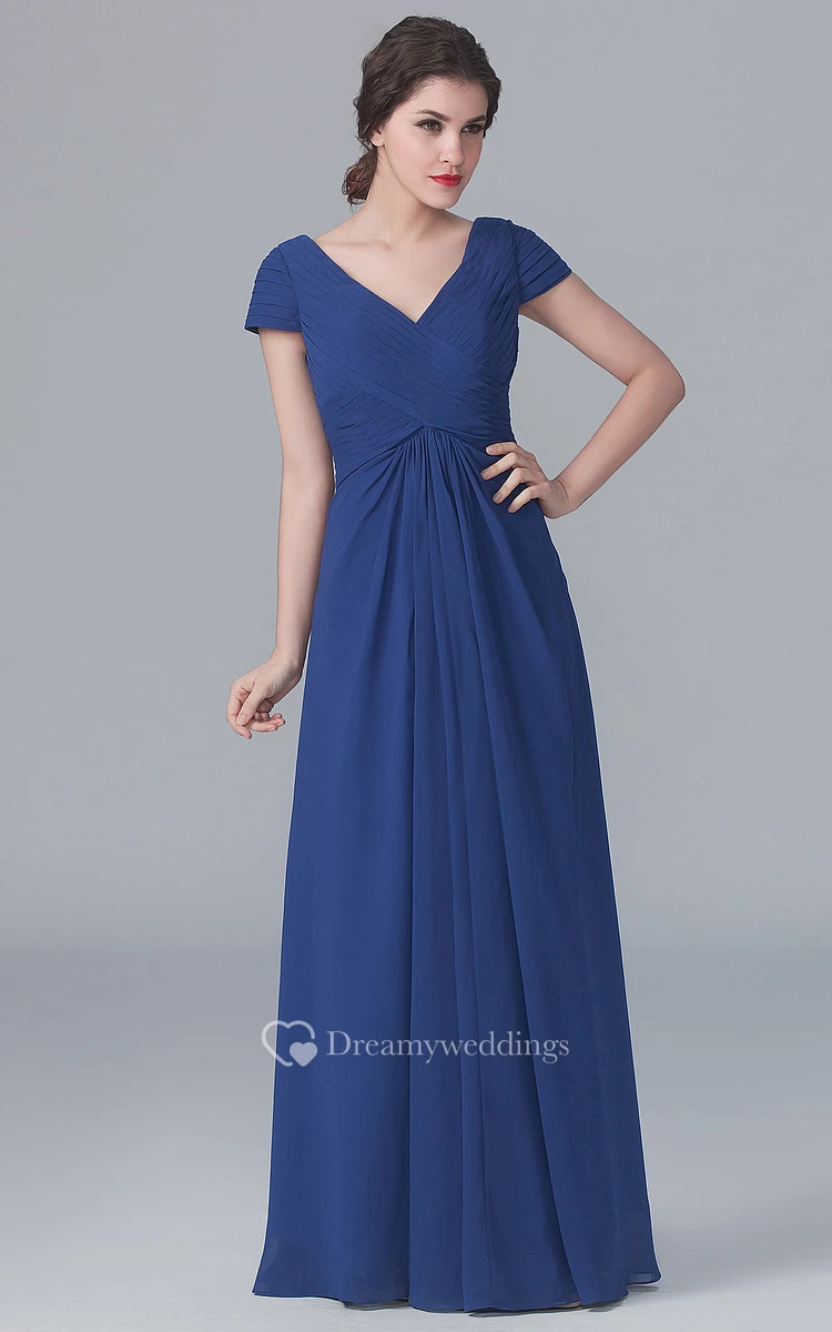 V-Neck Long A-Line Sleeves Dress With Pleatings