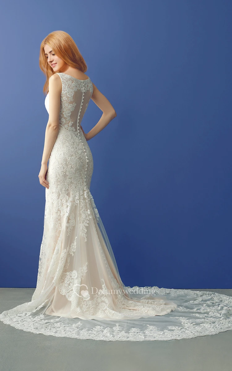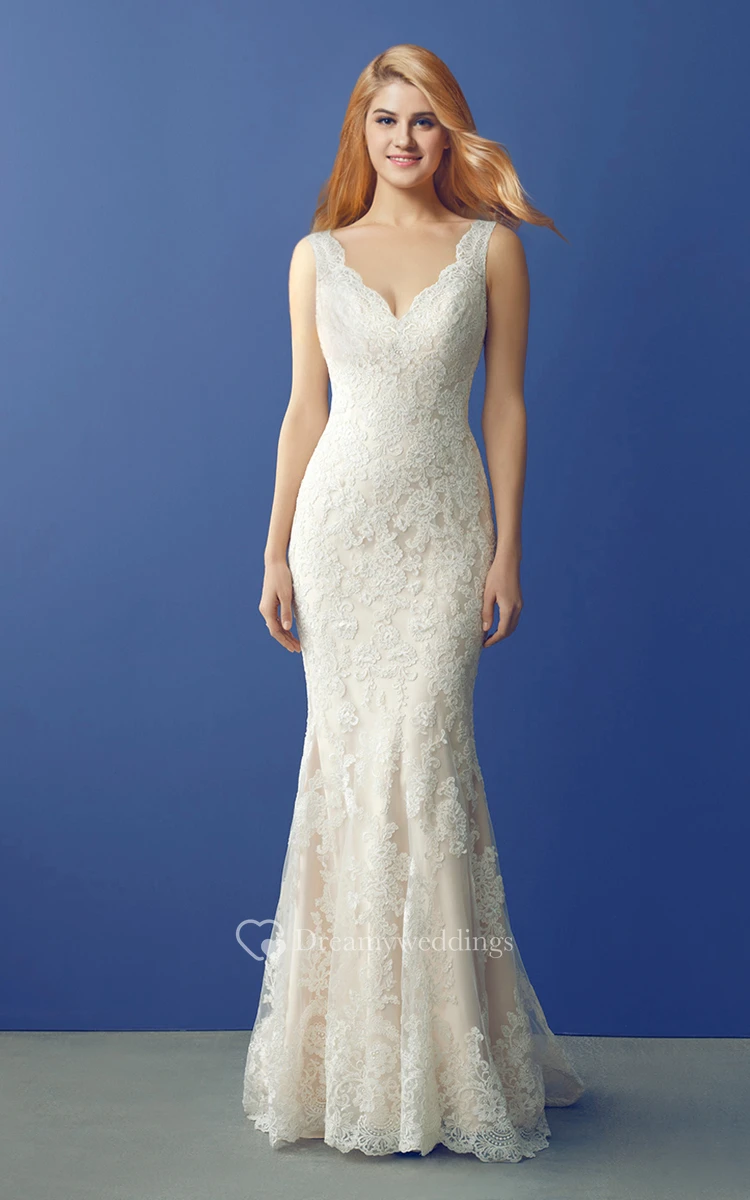 V Neck Long Lace Wedding Gown with Unique Back