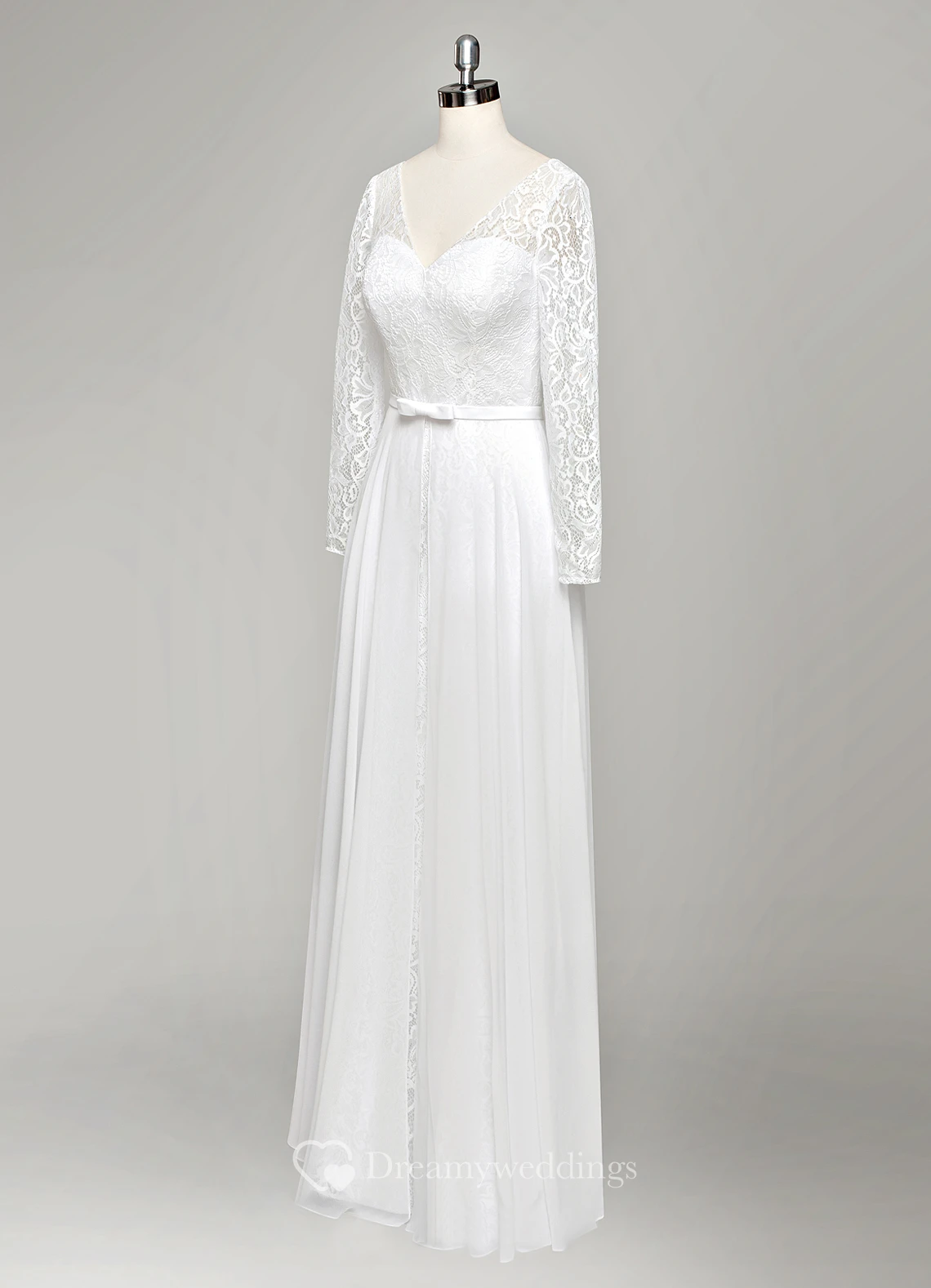 V-Neck Long Sleeve A-Line Lace and Chiffon Wedding Dress With Pleats