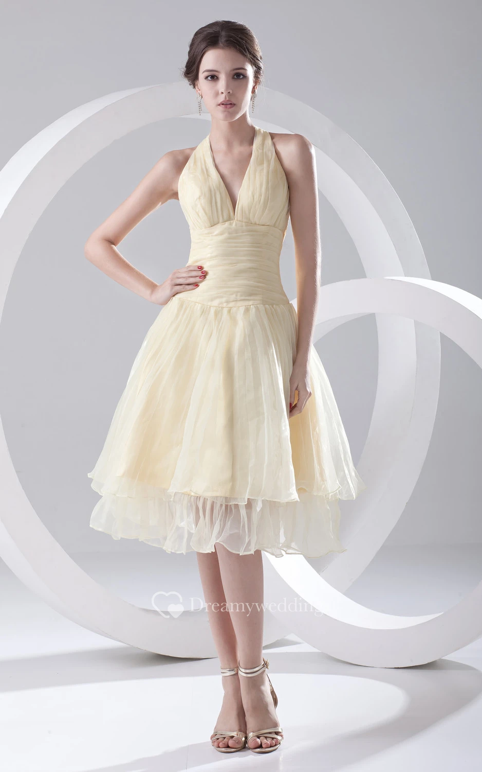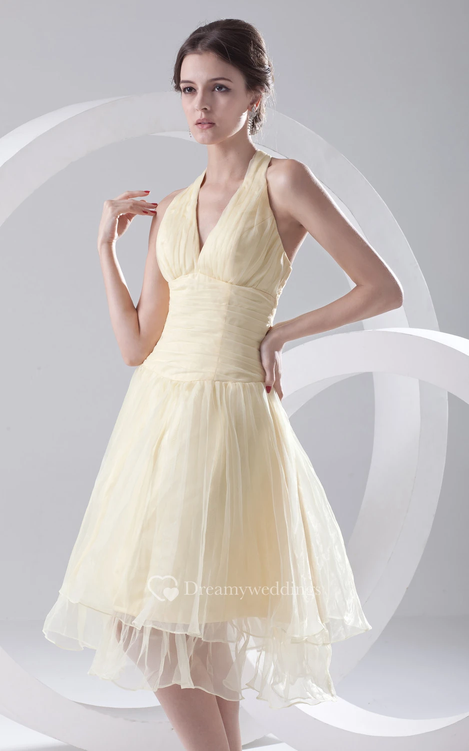 V-Neck Organza Short Dress With Pleating and Zipper-Back