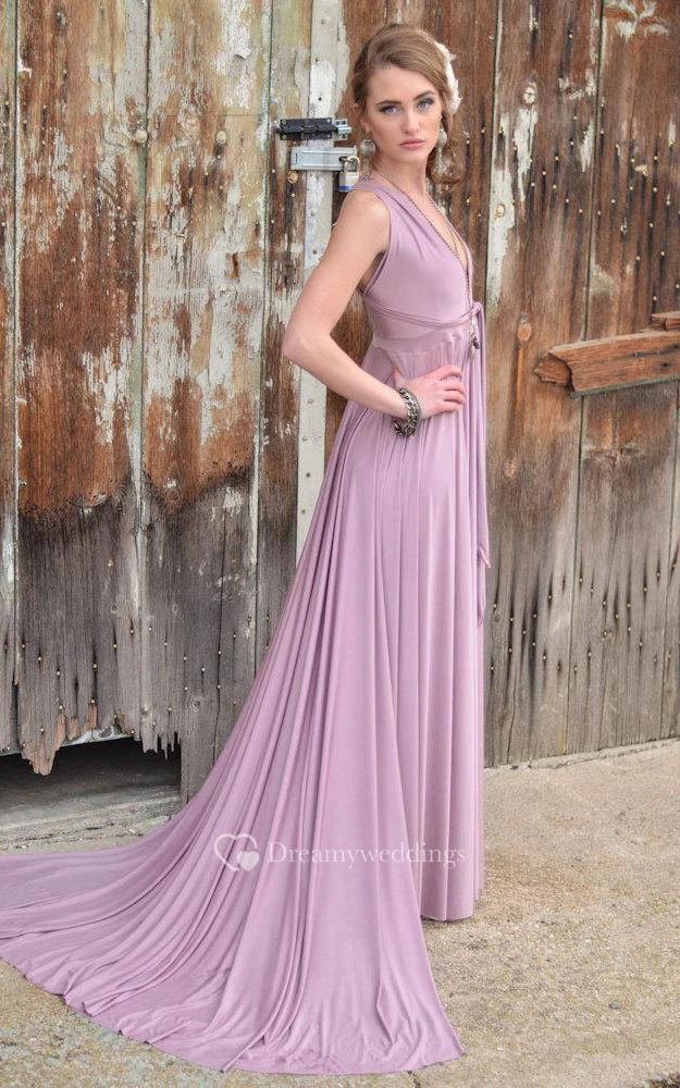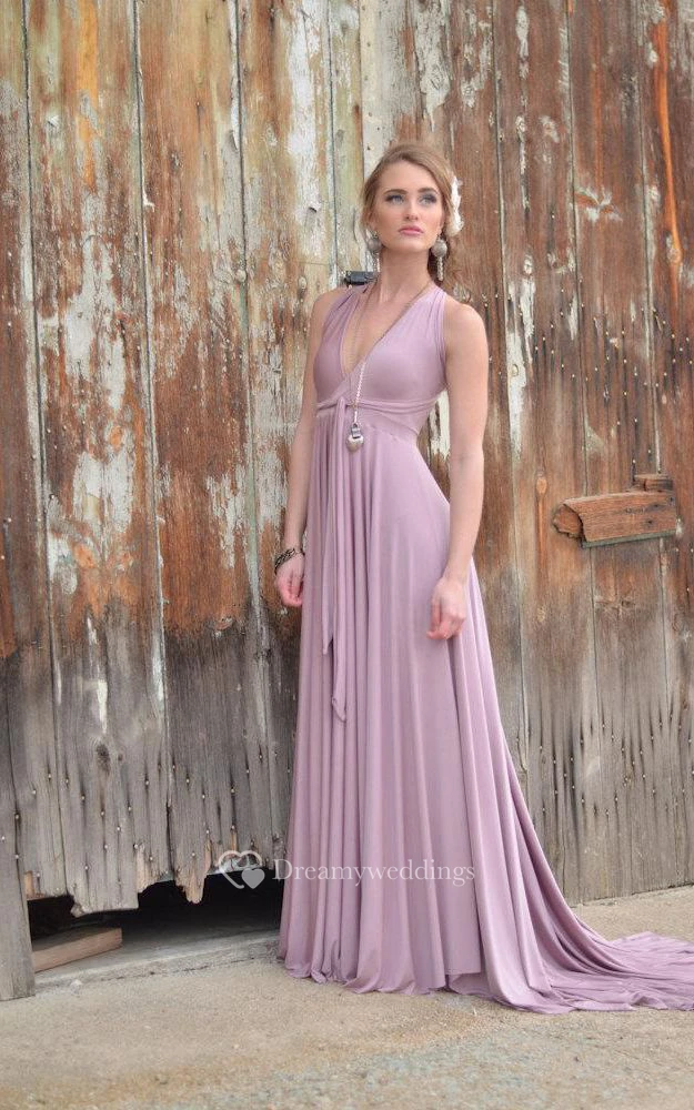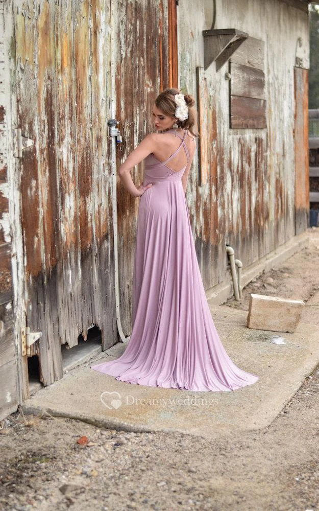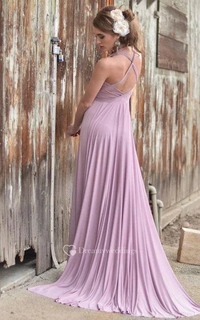 V Neck Pleated A-line Jersey Long Dress With Criss Cross Back