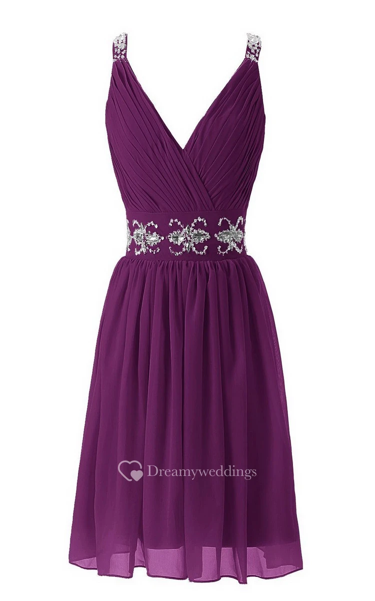 V-neck Rhinestoned Pleated A-line Short Dress With Band