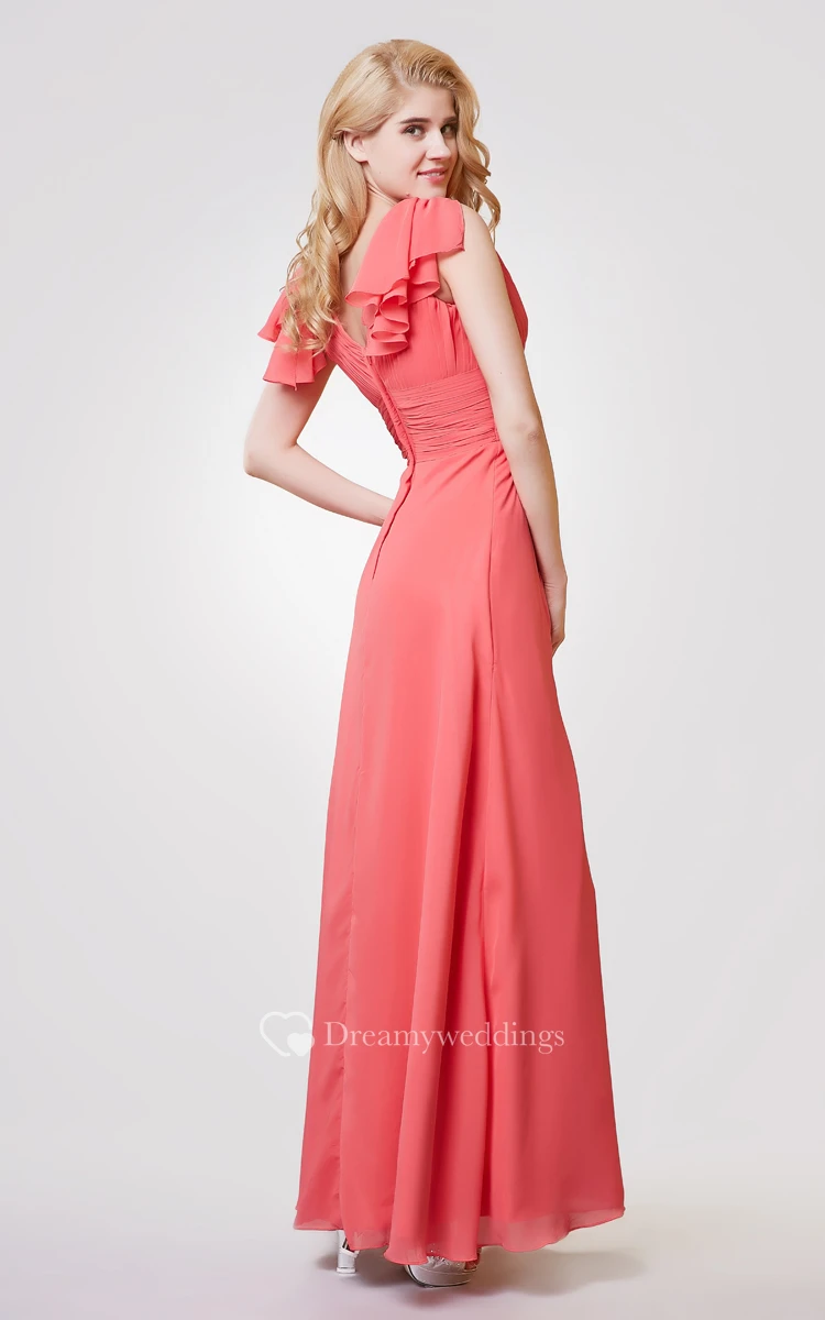 Your bridesmaids will look positively perfect in this gorgeous v-neck ruched a-line long chiffon dress with floral embellishments. A modern a-line silhouette flatters the form with a fitted bodice with a slimming v-neckline decked in delicate draping with ruffle cap sleeves. An elegant sash decked in beautiful floral rosettes cinches in the natural waistline for a figure flattering effect that would look great on any bridesmaid.