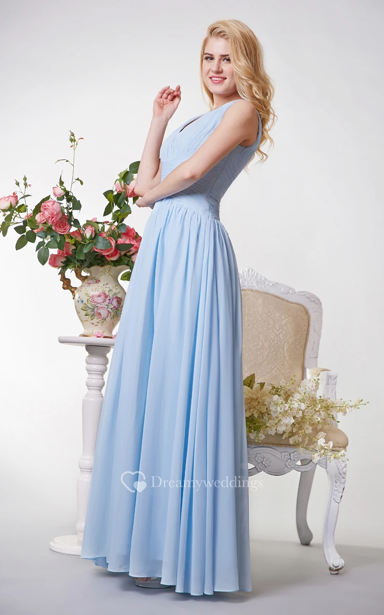 V-neck Ruched and Pleated A-line Long Chiffon Dress