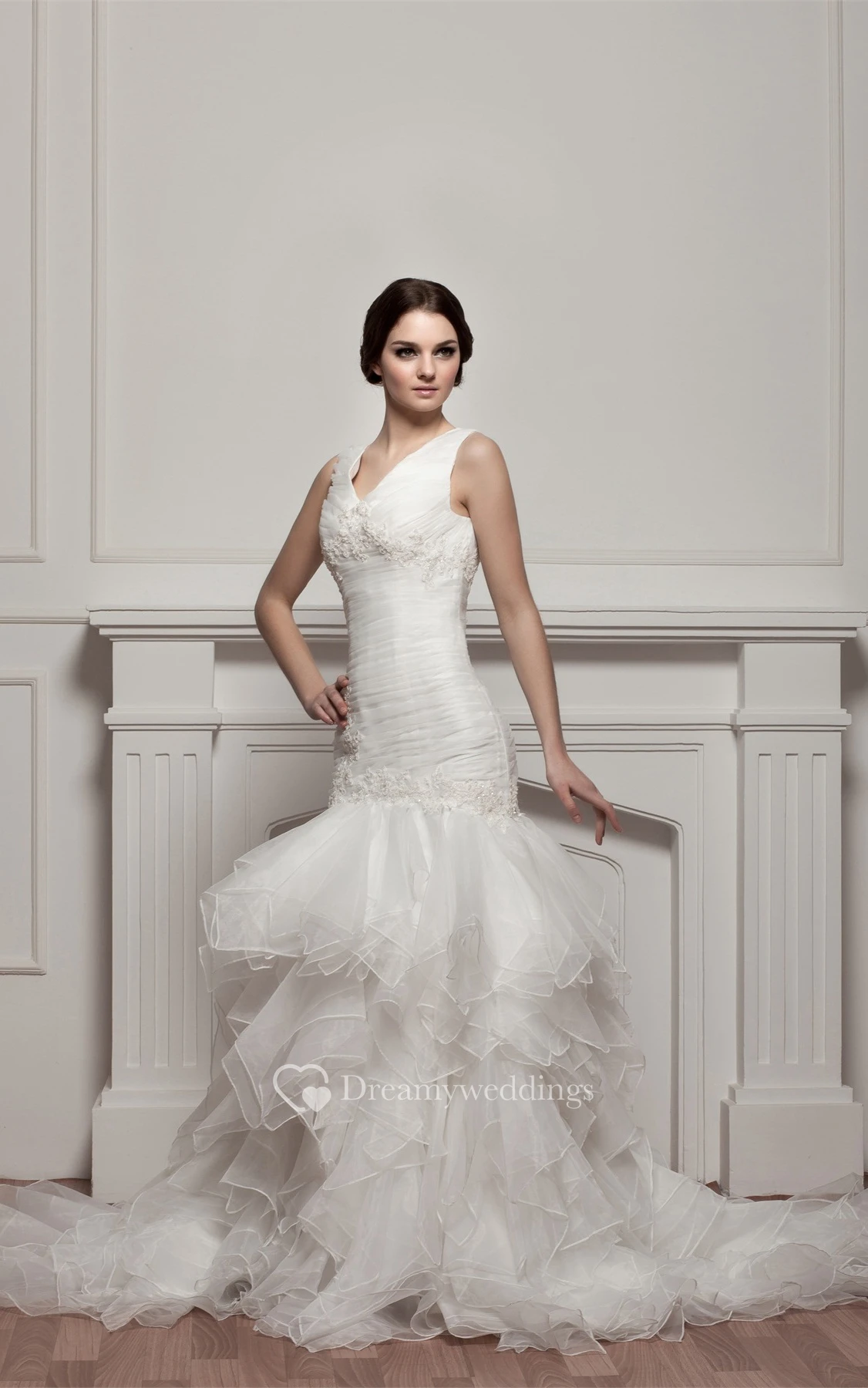 V-Neck Ruffled Mermaid Tiers and Dress With Appliques