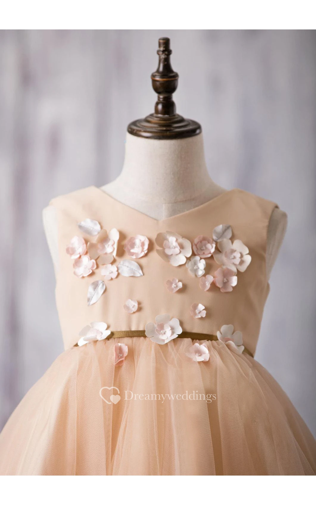 V Neck Sleeveless A-line Pleated Tulle Gown With Floral Bodice