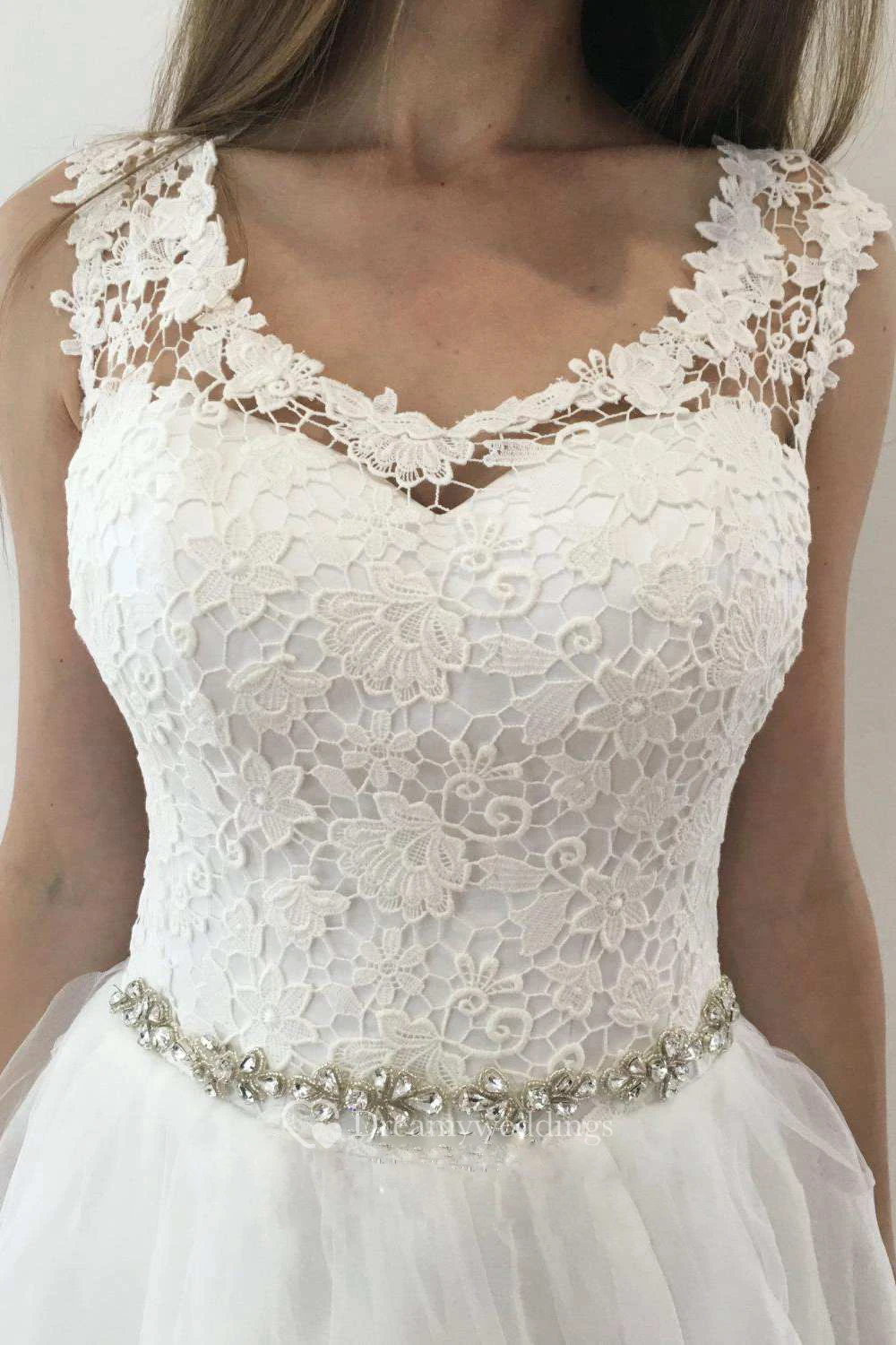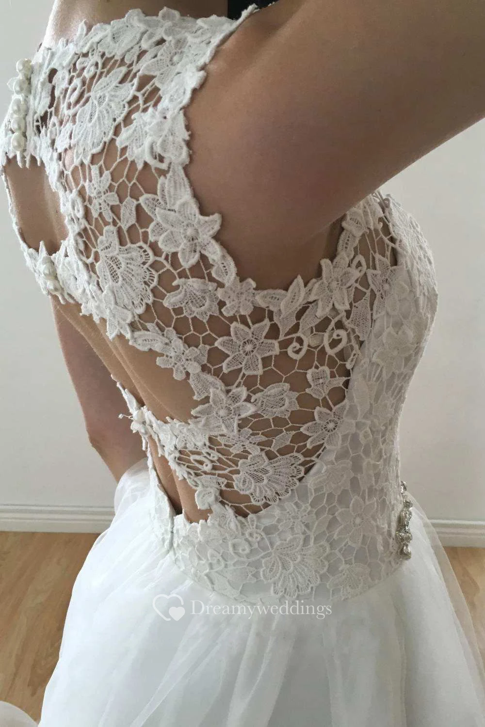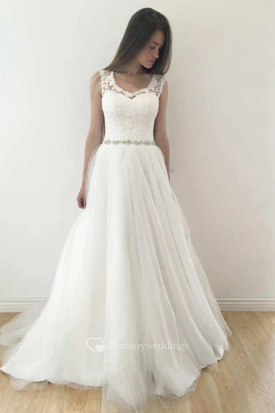 V-Neck Sleeveless A-Line Tulle Pleated Wedding Dress With Keyhole And Beaded Waist