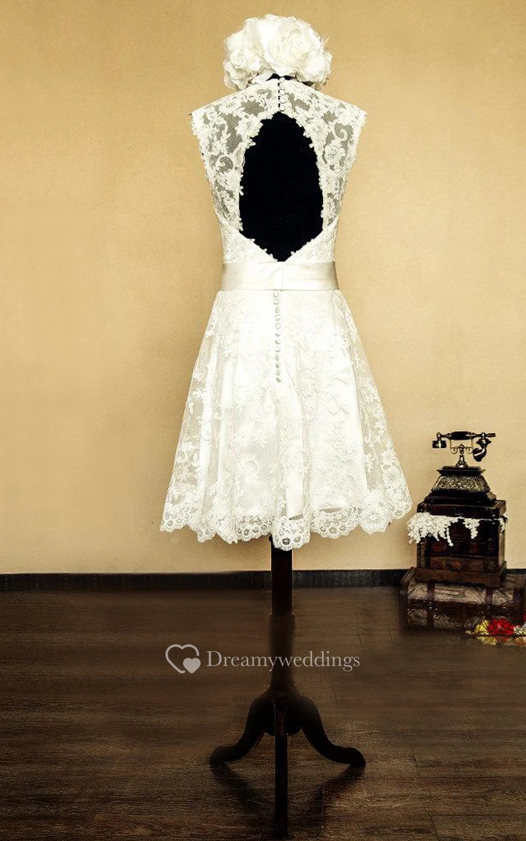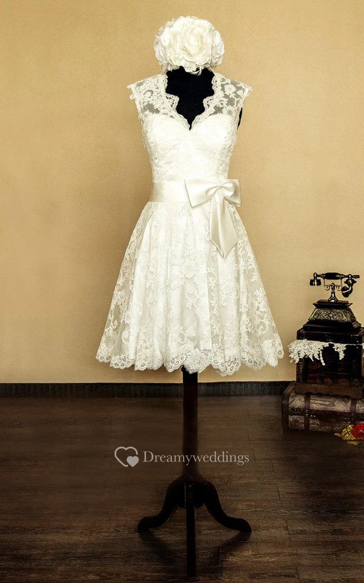 V-Neck Sleeveless Keyhole Back Short Lace Wedding Dress With Bow And Flower