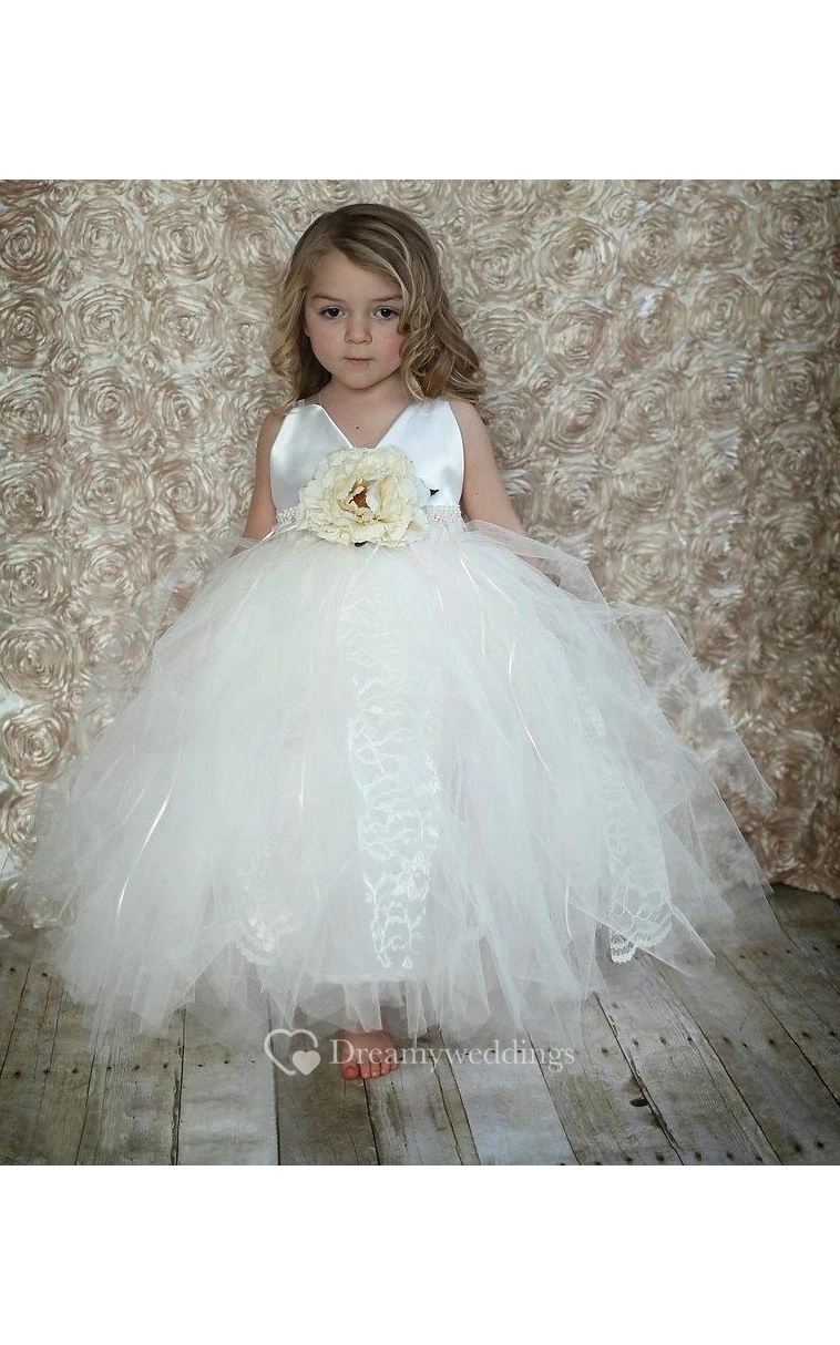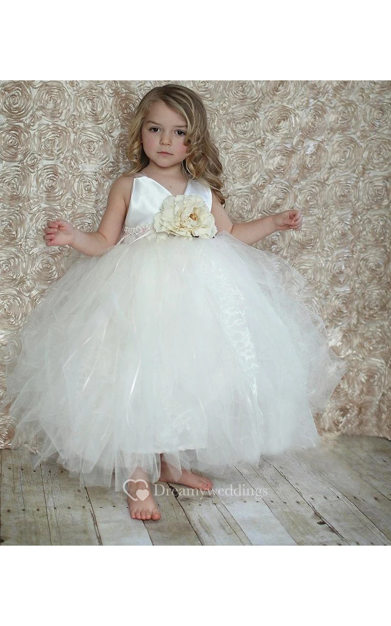 V Neck Tiered Tulle Ball Gown With Flower Sash
