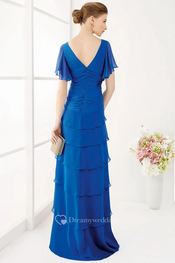 V Neck V Back Layered Chiffon Long Prom Dress With Ruffled Short Sleeves