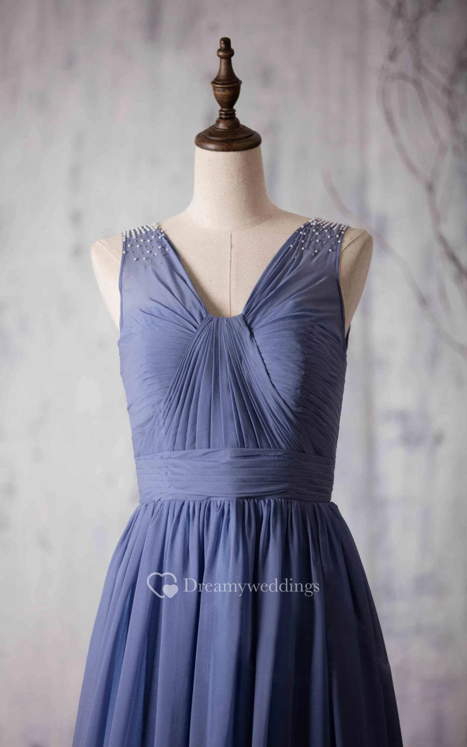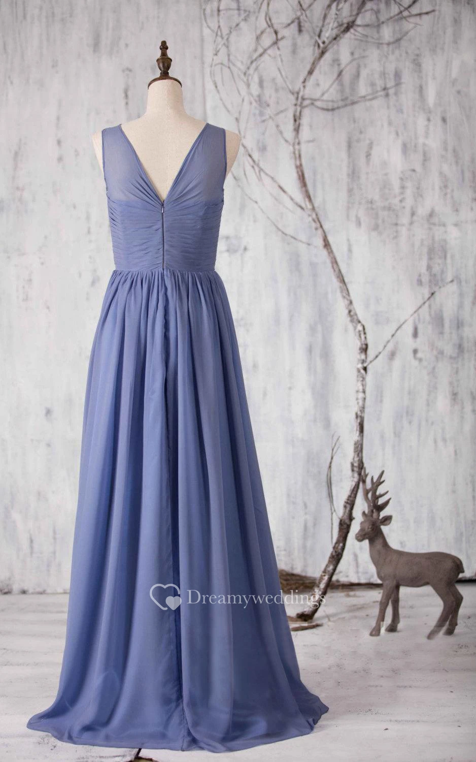 V Neck V Back Pleated A-line Chiffon Long Dress With Beadings