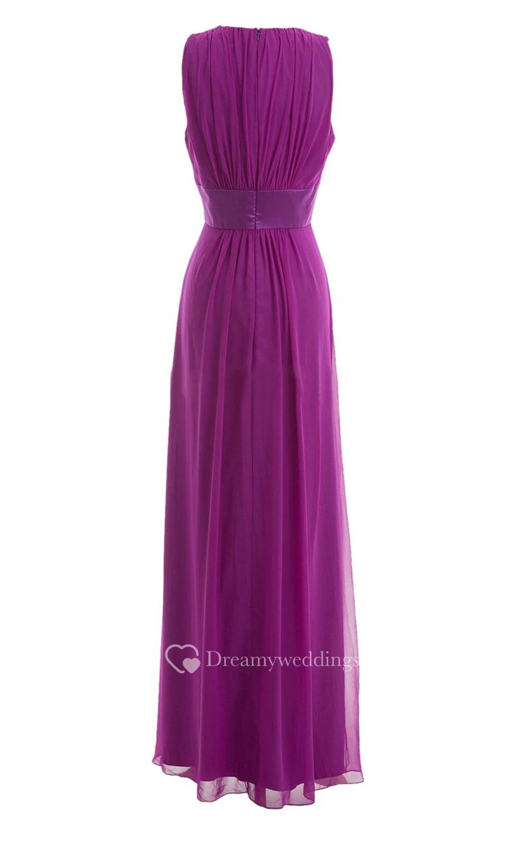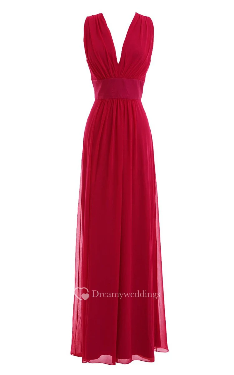 V-neckline Long Chiffon Dress With Satin Belt