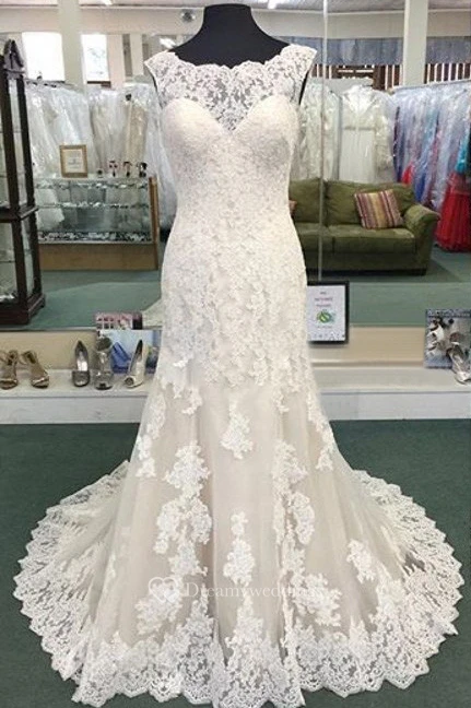 Vintage Bateau Neck Sheath Allover Lace Gown With Cap Sleeves