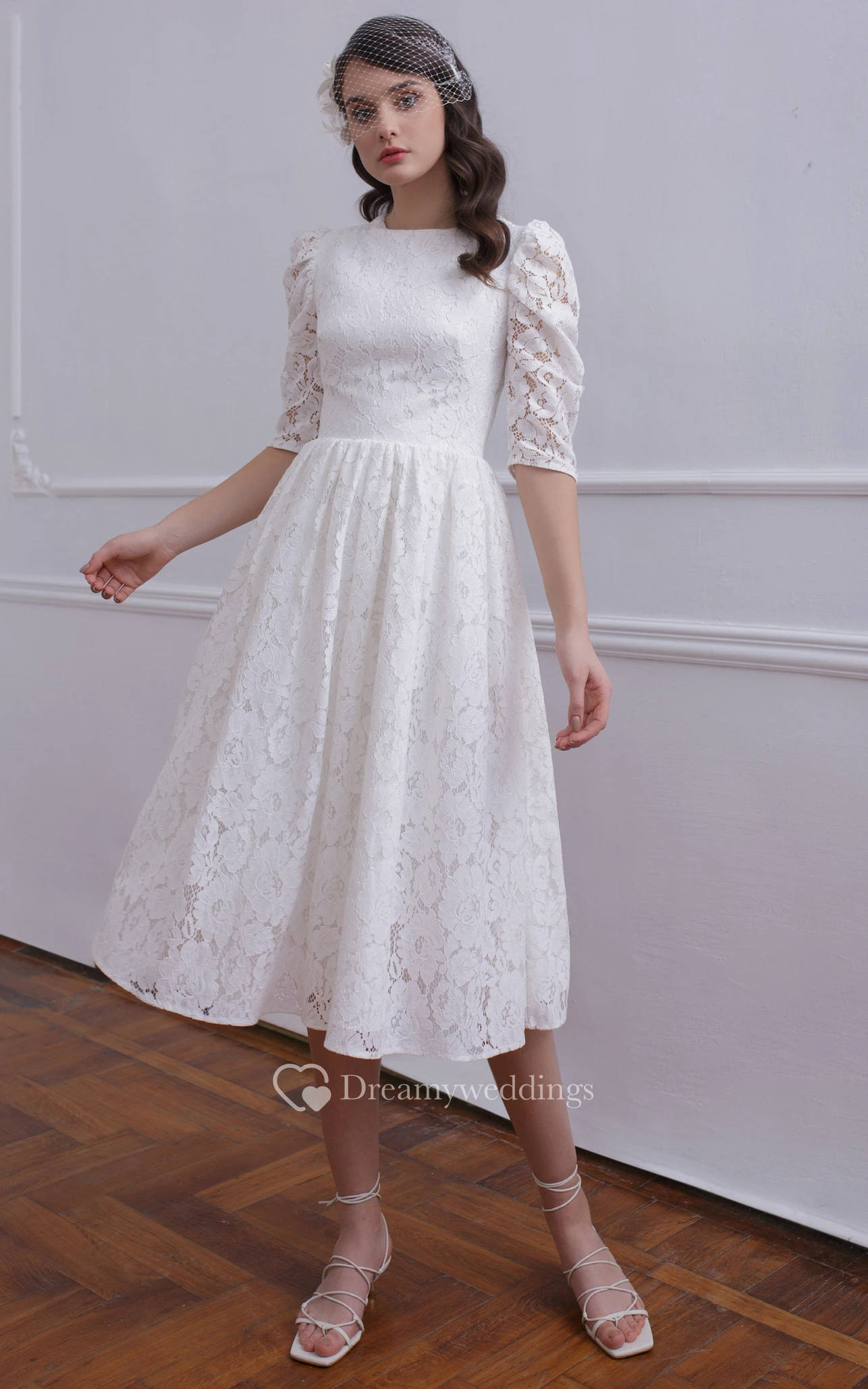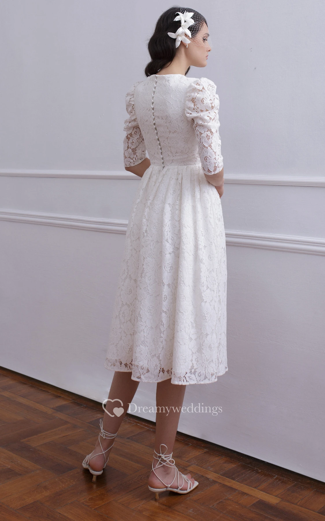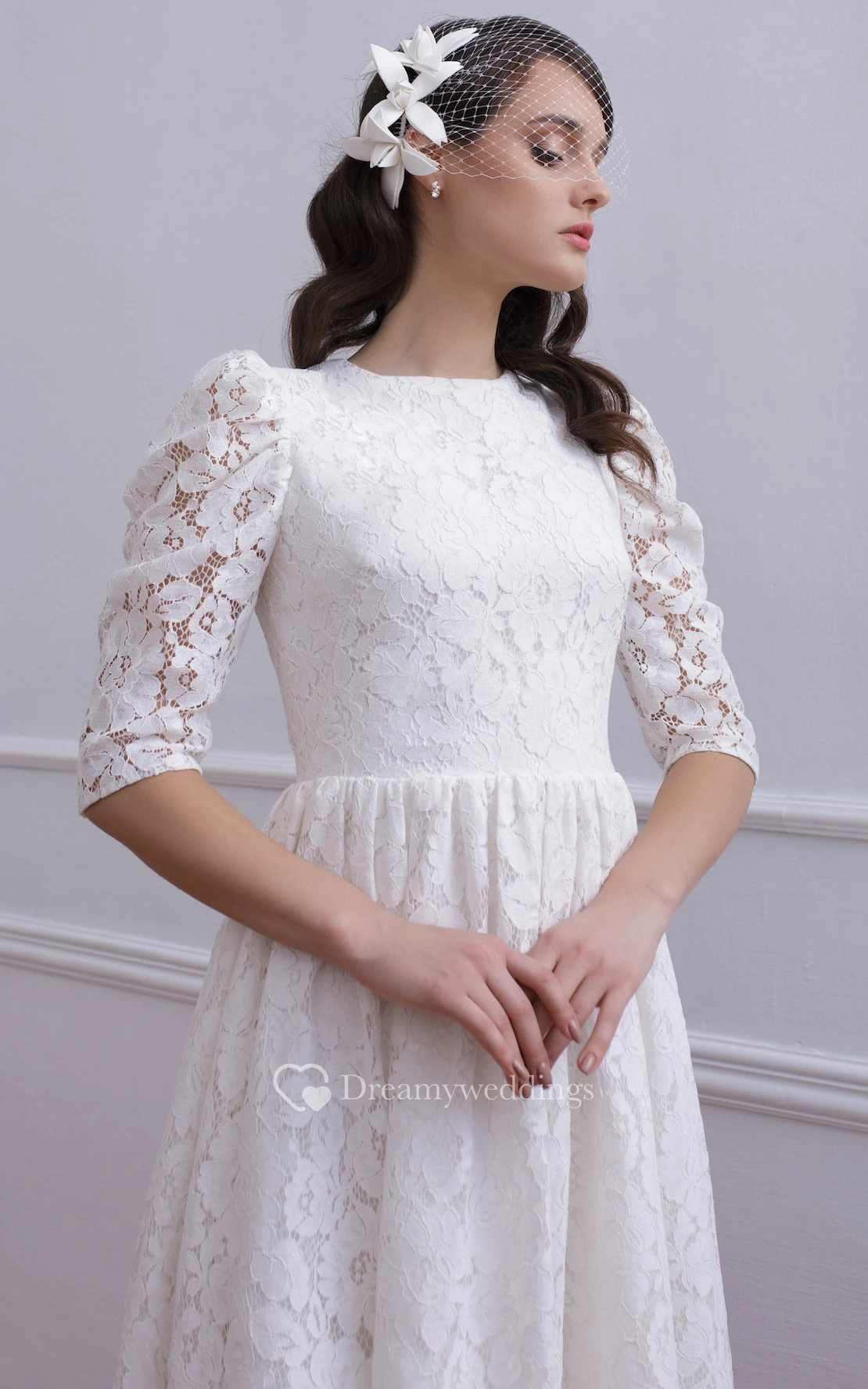 Vintage Half Sleeve Tea-length Lace A Line Wedding Dress with Ruching