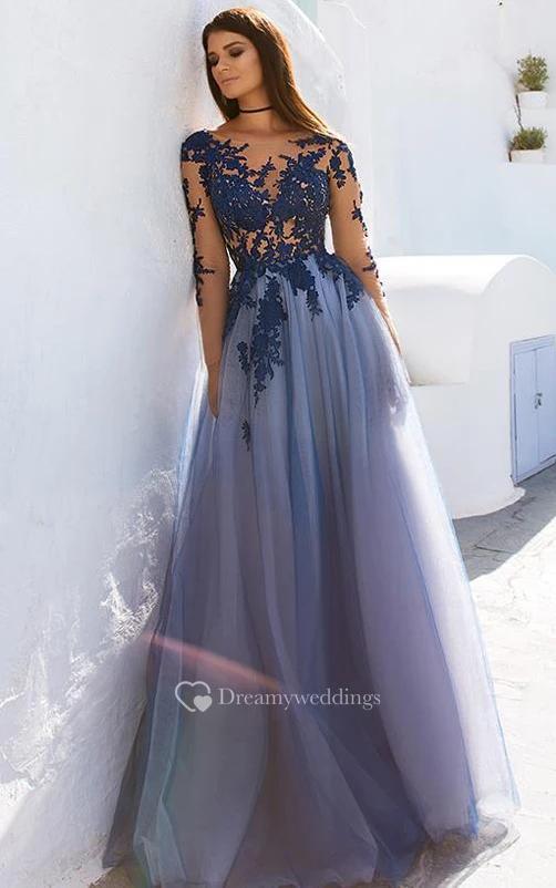 Vintage Lace Tulle A Line Bateau Long Sleeve Prom Dress With Keyhole Appliques
