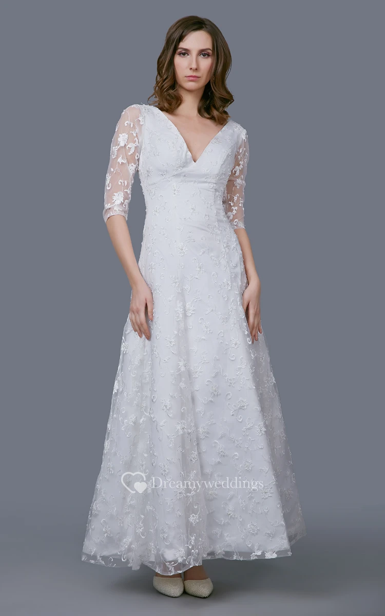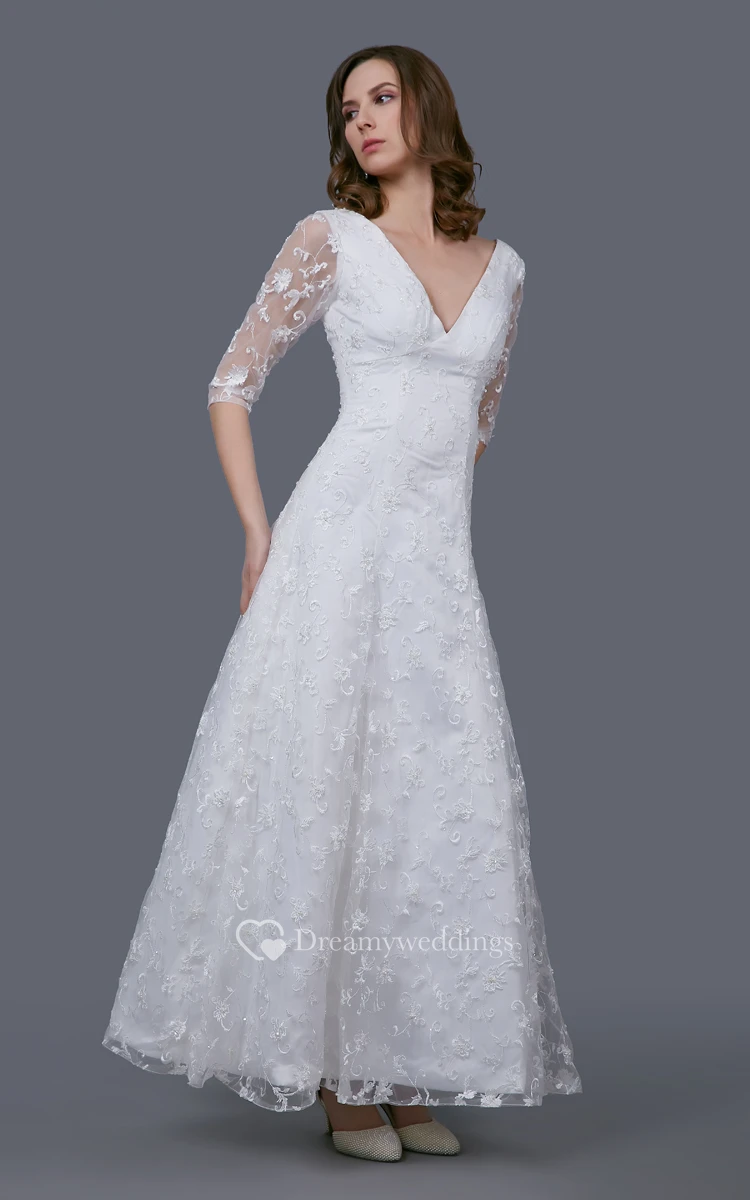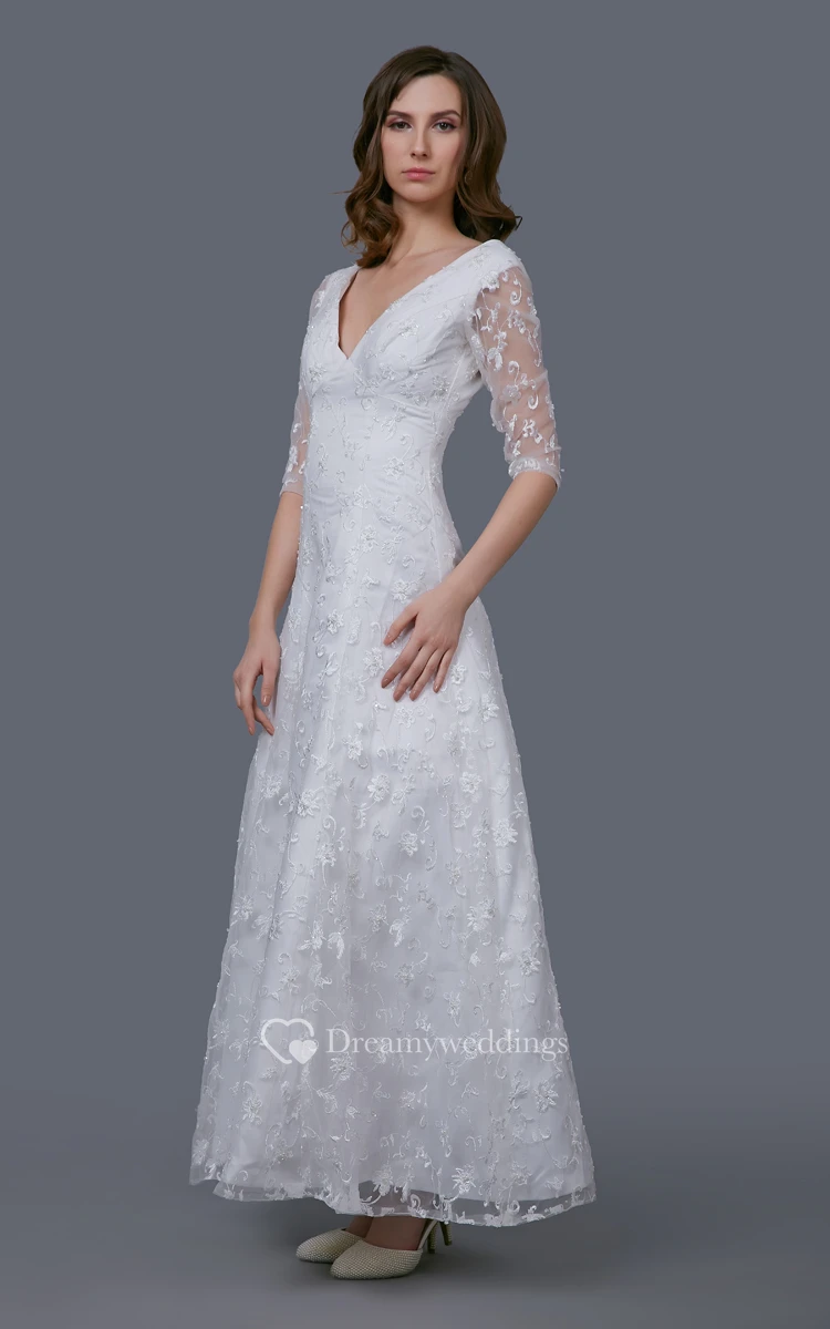 Vintage Long Lace Sleeve V-neck A-line Lace Gown With Pleats