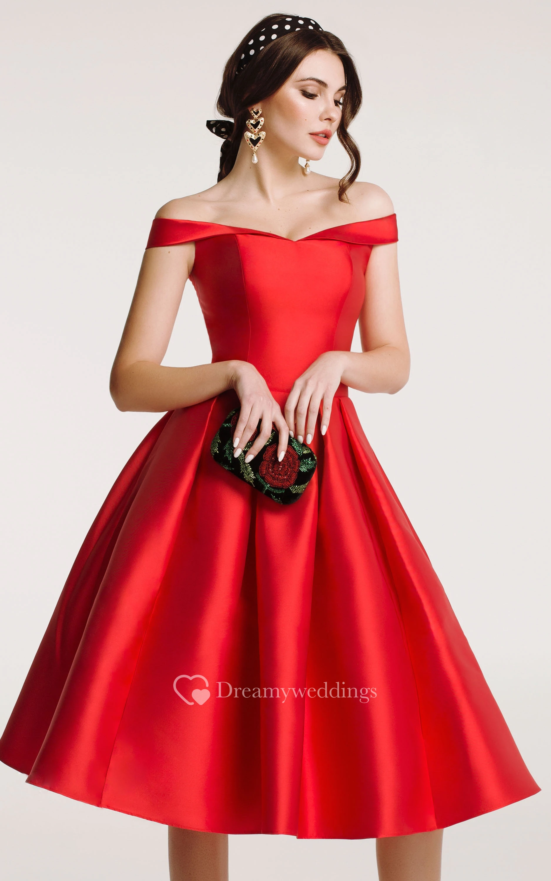 Vintage Off-the-shoulder Satin A Line Sleeveless Tea-length Cocktail Dress with Pleats