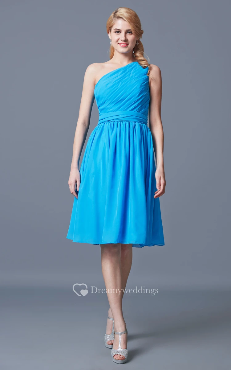 Vintage One Shoulder Ruched Knee Length Chiffon Dress With Sash