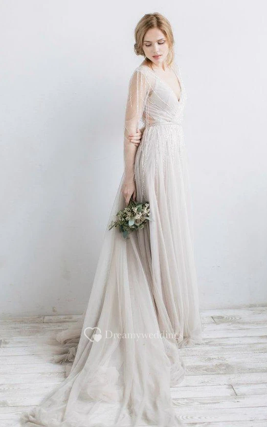 Long Sleeve V-Neck Illusion Tulle Weddig Dress With Beading